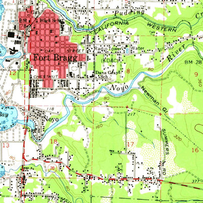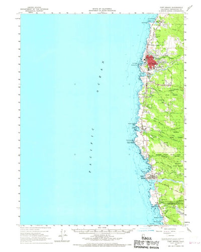 A 1960 historical topographic map of Fort Bragg in California produced by the United States Geological Survey (USGS). It shows contour lines, place names, water bodies and roads. Map services and data available from U.S. Geological Survey, National Geospatial Program. Map was obtained from https:...