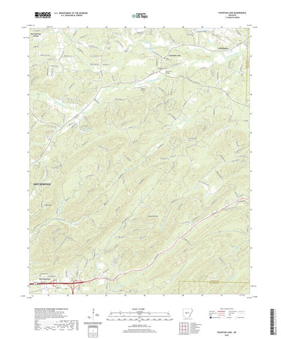 A digital topographic map of Fountain Lake in Arkansas produced by the United States Geological Survey (USGS) in 2020. The map is part of the National Map series of 7.5 minute quadrangle maps. It shows contour lines, place names, water bodies and roads. Map services and data available from U.S. G...