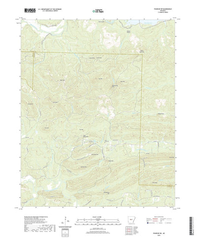 A digital topographic map of Fourche SW in Arkansas produced by the United States Geological Survey (USGS) in 2020. The map is part of the National Map series of 7.5 minute quadrangle maps. It shows contour lines, place names, water bodies and roads. Map services and data available from U.S. Geol...