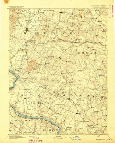A 1894 historical topographic map of Frederick in Maryland produced by the United States Geological Survey (USGS). It shows contour lines, place names, water bodies and roads. Map services and data available from U.S. Geological Survey, National Geospatial Program. Map was obtained from https://w...