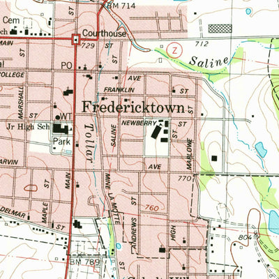 A 1980 historical topographic map of Fredericktown in Missouri produced by the United States Geological Survey (USGS). It shows contour lines, place names, water bodies and roads. Map services and data available from U.S. Geological Survey, National Geospatial Program. Map was obtained from https...