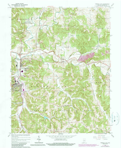 A 1965 historical topographic map of French Lick in Indiana produced by the United States Geological Survey (USGS). It shows contour lines, place names, water bodies and roads. Map services and data available from U.S. Geological Survey, National Geospatial Program. Map was obtained from https://...