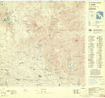 This is a topographic map of Garoga in Indonesia. It is produced at a scale of 1:50,000 and was released in 1985. The map depicts buildings and other structures, roads, railroads, vegetation, elevation with 25m contour, relief and water bodies. Data was obtained from Badan Informasi Geospasial an...