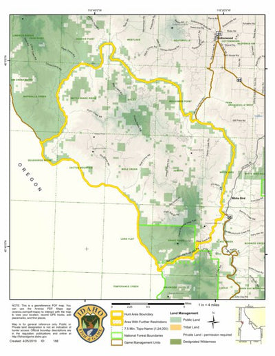 This map is part of the 2019 Hunt Area Map Index produced by the Idaho Department Fish & Game and uploaded to Avenza with full permission from the department. This map depicts the General Season Hunt Areas for Turkey in Unit 13, which encompasses All of Unit 13.