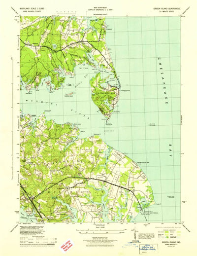 A 1944 historical topographic map of Gibson Island in Maryland produced by the United States Geological Survey (USGS). It shows contour lines, place names, water bodies and roads. Map services and data available from U.S. Geological Survey, National Geospatial Program. Map was obtained from https...