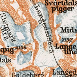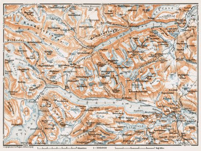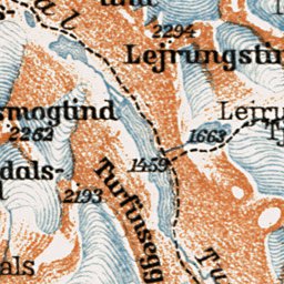 Historical map of the vicinities of Gjendesjö and Bygdinsjö Lakes from 1931, with location in Norway, produced by Wagner & Debes, at the scale of 1:200,000. This digitally re-mastered image is a part of the Discus Media 1900 Collection.