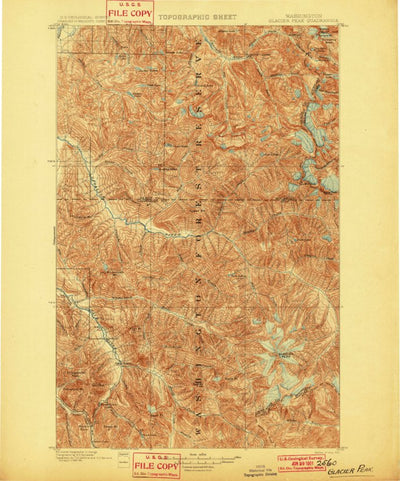 A 1901 historical topographic map of Glacier Peak in Washington produced by the United States Geological Survey (USGS). It shows contour lines, place names, water bodies and roads. Map services and data available from U.S. Geological Survey, National Geospatial Program. Map was obtained from http...