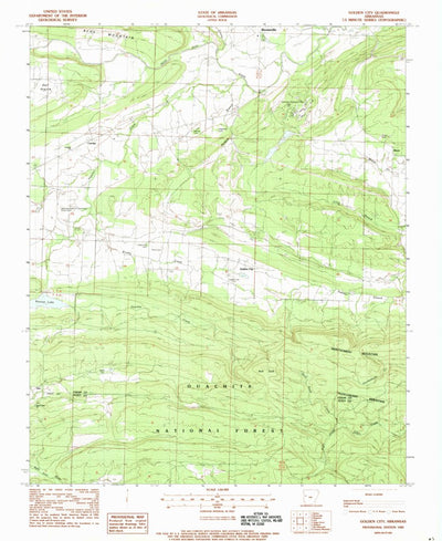 A 1983 historical topographic map of Golden City in Arkansas produced by the United States Geological Survey (USGS). It shows contour lines, place names, water bodies and roads. Map services and data available from U.S. Geological Survey, National Geospatial Program. Map was obtained from https:/...