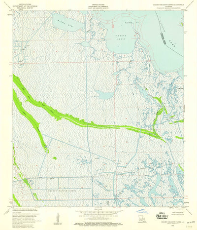 A 1956 historical topographic map of Golden Meadow Farms in Louisiana produced by the United States Geological Survey (USGS). It shows contour lines, place names, water bodies and roads. Map services and data available from U.S. Geological Survey, National Geospatial Program. Map was obtained fro...