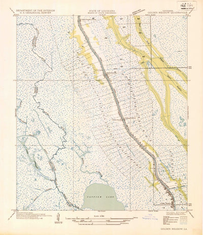 A 1935 historical topographic map of Golden Meadow in Louisiana produced by the United States Geological Survey (USGS). It shows contour lines, place names, water bodies and roads. Map services and data available from U.S. Geological Survey, National Geospatial Program. Map was obtained from http...