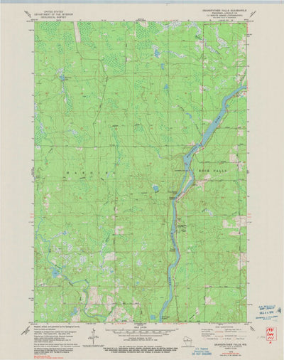 A 1978 historical topographic map of Grandfather Falls in Wisconsin produced by the United States Geological Survey (USGS). It shows contour lines, place names, water bodies and roads. Map services and data available from U.S. Geological Survey, National Geospatial Program. Map was obtained from ...