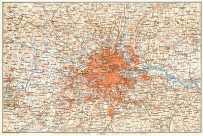 Historical map of the Greater London from 1909, with location in Great Britain, produced by Wagner & Debes, at the scale of 1:191,400. This digitally re-mastered image is a part of the Discus Media 1900 Collection.