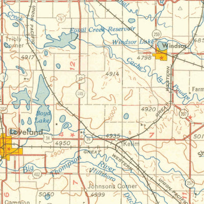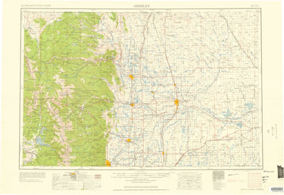 A 1958 historical topographic map of Greeley in Colorado produced by the United States Geological Survey (USGS). It shows contour lines, place names, water bodies and roads. Map services and data available from U.S. Geological Survey, National Geospatial Program. Map was obtained from https://www...