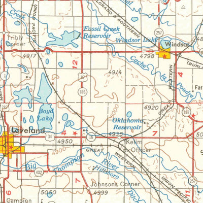 A 1964 historical topographic map of Greeley in Colorado produced by the United States Geological Survey (USGS). It shows contour lines, place names, water bodies and roads. Map services and data available from U.S. Geological Survey, National Geospatial Program. Map was obtained from https://www...