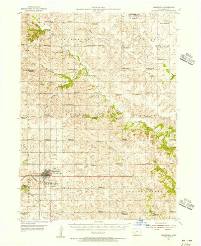A 1954 historical topographic map of Greenfield in Iowa produced by the United States Geological Survey (USGS). It shows contour lines, place names, water bodies and roads. Map services and data available from U.S. Geological Survey, National Geospatial Program. Map was obtained from https://www....