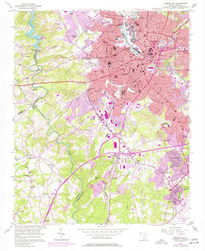 A 1957 historical topographic map of Greenville in South Carolina produced by the United States Geological Survey (USGS). It shows contour lines, place names, water bodies and roads. Map services and data available from U.S. Geological Survey, National Geospatial Program. Map was obtained from ht...