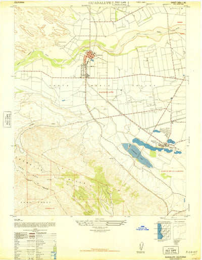 A 1947 historical topographic map of Guadalupe in California produced by the United States Geological Survey (USGS). It shows contour lines, place names, water bodies and roads. Map services and data available from U.S. Geological Survey, National Geospatial Program. Map was obtained from https:/...