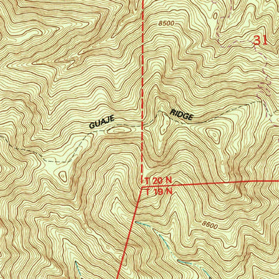A 1984 historical topographic map of Guaje Mountain in New Mexico produced by the United States Geological Survey (USGS). It shows contour lines, place names, water bodies and roads. Map services and data available from U.S. Geological Survey, National Geospatial Program. Map was obtained from ht...