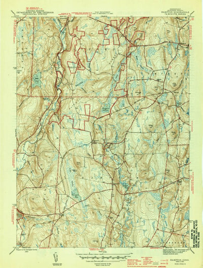 A 1944 historical topographic map of Hampton in Connecticut produced by the United States Geological Survey (USGS). It shows contour lines, place names, water bodies and roads. Map services and data available from U.S. Geological Survey, National Geospatial Program. Map was obtained from https://...