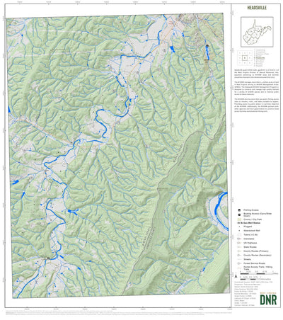 This map was produced using USGS 7.5-minute quadrangles. The maps shows locations of public lands including, but not limited to national forests, state forests, wildlife management areas, and county/city parks in the Headsville quadrangle. The map also shows West Virginia Division of Natural Reso...