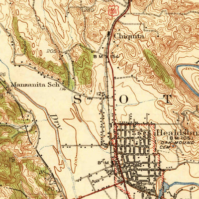 A 1940 historical topographic map of Healdsburg in California produced by the United States Geological Survey (USGS). It shows contour lines, place names, water bodies and roads. Map services and data available from U.S. Geological Survey, National Geospatial Program. Map was obtained from https:...