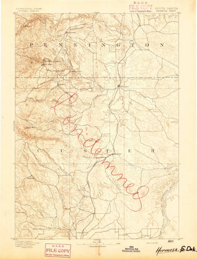 A 1894 historical topographic map of Hermosa in South Dakota produced by the United States Geological Survey (USGS). It shows contour lines, place names, water bodies and roads. Map services and data available from U.S. Geological Survey, National Geospatial Program. Map was obtained from https:/...