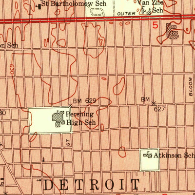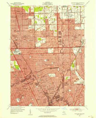 A 1952 historical topographic map of Highland Park in Michigan produced by the United States Geological Survey (USGS). It shows contour lines, place names, water bodies and roads. Map services and data available from U.S. Geological Survey, National Geospatial Program. Map was obtained from https...