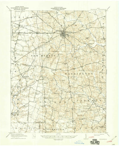 A 1917 historical topographic map of Hillsboro in Ohio produced by the United States Geological Survey (USGS). It shows contour lines, place names, water bodies and roads. Map services and data available from U.S. Geological Survey, National Geospatial Program. Map was obtained from https://www.s...