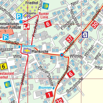 Basic road map of Hoch-rum just outside of Innsbruck Austria. Also displays hiking and biking trails, accomodations, and other points of interest.