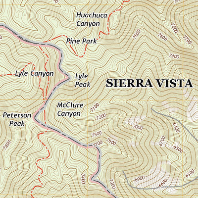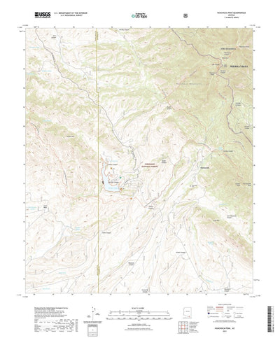 A digital topographic map of Huachuca Peak in Arizona produced by the United States Geological Survey (USGS) in 2021. The map is part of the National Map series of 7.5 minute quadrangle maps. It shows contour lines, place names, water bodies and roads. Map services and data available from U.S. Ge...