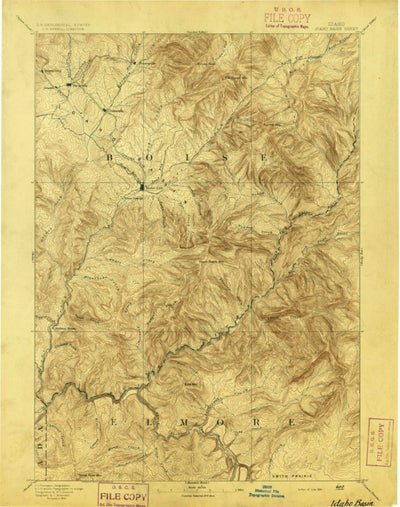 A 1894 historical topographic map of Idaho City in Idaho produced by the United States Geological Survey (USGS). It shows contour lines, place names, water bodies and roads. Map services and data available from U.S. Geological Survey, National Geospatial Program. Map was obtained from https://www...