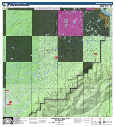 This is a map of Innoko National Wildlife Refuge within the State of Alaska. It depicts the refuge and wilderness boundaries, hillshaded topography, and Federal, State of Alaska, and private ownership boundaries within Innoko NWR.