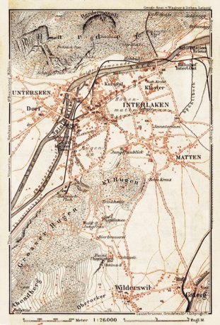 Old vintage map of Interlaken and vicinity from 1909, located in Switzerland, produced by Wagner & Debes, at the scale of 1:26,000. This digitally re-mastered image is a part of the Discus Media 1900 Collection.