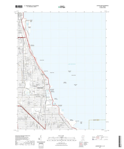 A digital topographic map of Jackson Park in Illinois produced by the United States Geological Survey (USGS) in 2021. The map is part of the National Map series of 7.5 minute quadrangle maps. It shows contour lines, place names, water bodies and roads. Map services and data available from U.S. Ge...