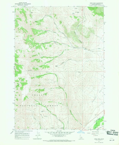 A 1967 historical topographic map of Jerry Peak in Idaho produced by the United States Geological Survey (USGS). It shows contour lines, place names, water bodies and roads. Map services and data available from U.S. Geological Survey, National Geospatial Program. Map was obtained from https://www...