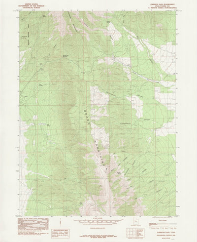 A 1985 historical topographic map of Johnson Pass in Utah produced by the United States Geological Survey (USGS). It shows contour lines, place names, water bodies and roads. Map services and data available from U.S. Geological Survey, National Geospatial Program. Map was obtained from https://ww...