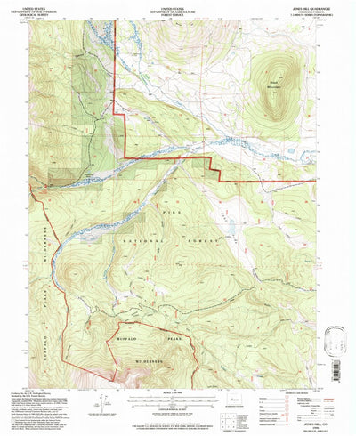 A 1994 historical topographic map of Jones Hill in Colorado produced by the United States Geological Survey (USGS). It shows contour lines, place names, water bodies and roads. Map services and data available from U.S. Geological Survey, National Geospatial Program. Map was obtained from https://...