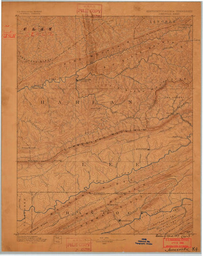 A 1887 historical topographic map of Jonesville in Kentucky produced by the United States Geological Survey (USGS). It shows contour lines, place names, water bodies and roads. Map services and data available from U.S. Geological Survey, National Geospatial Program. Map was obtained from https://...