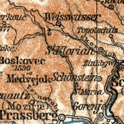 Historical map of Karawanken Mountains, 1929, in Slovenia, then in Yugoslavia, by Wagner & Debes, at the scale of 1:500,000. Digitally restored. A part of the Discus Media 1900 Collection.