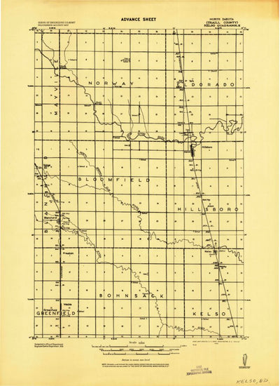 A 1943 historical topographic map of Kelso in North Dakota produced by the United States Geological Survey (USGS). It shows contour lines, place names, water bodies and roads. Map services and data available from U.S. Geological Survey, National Geospatial Program. Map was obtained from https://w...
