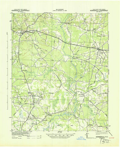 A 1943 historical topographic map of Kenansville in North Carolina produced by the United States Geological Survey (USGS). It shows contour lines, place names, water bodies and roads. Map services and data available from U.S. Geological Survey, National Geospatial Program. Map was obtained from h...