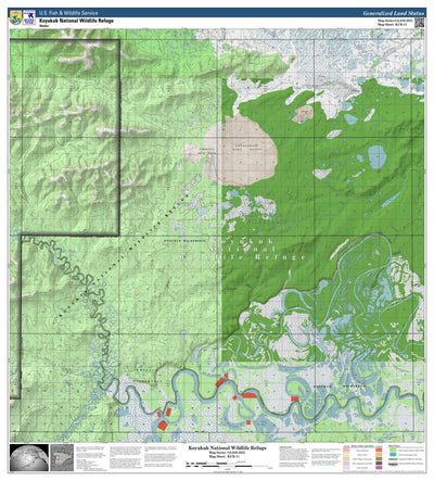 This is a map of Koyukuk National Wildlife Refuge within the State of Alaska. It depicts the refuge and wilderness boundaries, hillshaded topography, and Federal, State of Alaska, and private ownership boundaries within Koyukuk NWR.