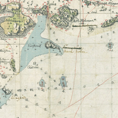 Santahaminan karttalehti XVI-19 1:20 000, Kuninkaallinen merikartasto 1791-1796, C. N. Klerckerin kartoitustyö, lehden koko 70 cm x 50 cm, ruotsinkielinen, käsinvärjätty, sisältää matalan vedenalueet, karikot, laivaväylät ja syvyyslukuja