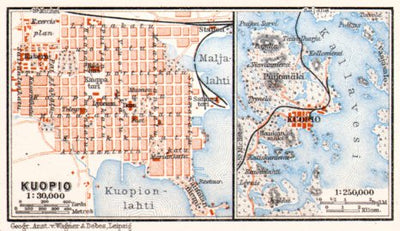 Historical map of Kuopio environs from 1914, in Finland, then in the Russian Empire, produced by Wagner & Debes, at the scale 1:150,000. Digitally restored. A part of the Discus Media 1900 Collection.