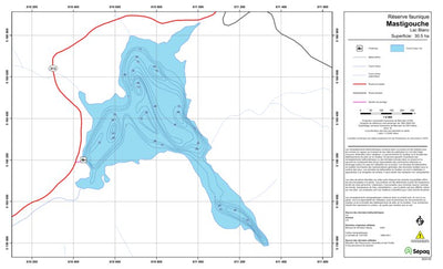 Carte de lac de la Sépaq. Selon les données disponibles, la carte peut présenter diverses informations telles que la bathymétrie ou les sites favorables à la pêche.