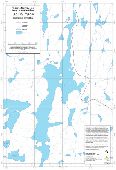 Carte de lac de la Sépaq. Selon les données disponibles, la carte peut présenter diverses informations telles que la bathymétrie ou les sites favorables à la pêche.