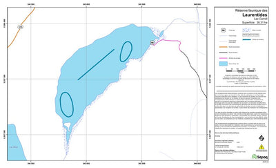 Carte de lac de la Sépaq. Selon les données disponibles, la carte peut présenter diverses informations telles que la bathymétrie ou les sites favorables à la pêche.