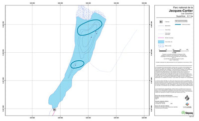 Carte de lac de la Sépaq. Selon les données disponibles, la carte peut présenter diverses informations telles que la bathymétrie ou les sites favorables à la pêche.