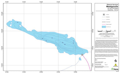 Carte de lac de la Sépaq. Selon les données disponibles, la carte peut présenter diverses informations telles que la bathymétrie ou les sites favorables à la pêche.