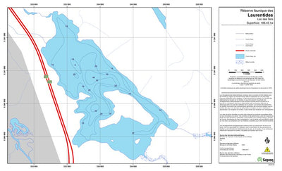 Carte de lac de la Sépaq. Selon les données disponibles, la carte peut présenter diverses informations telles que la bathymétrie ou les sites favorables à la pêche.